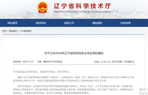 遼寧省科學技術廳2020年12月7日發布《關于公布2020年遼寧省新型創新主體名單的通知》,我公司被認定為“遼寧省雛鷹企業”。