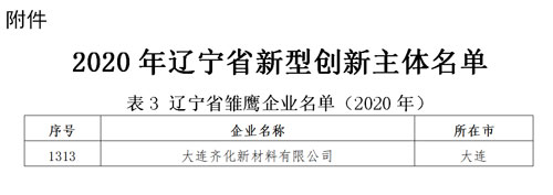 大連齊化新材料被認定為“遼寧省雛鷹企業”