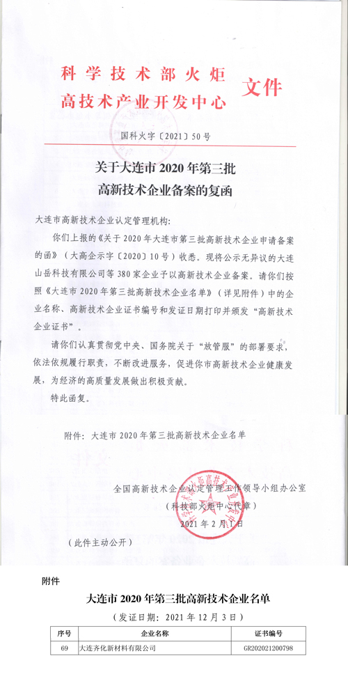 大連齊化新材料被認定為國家級“高新技術企業”