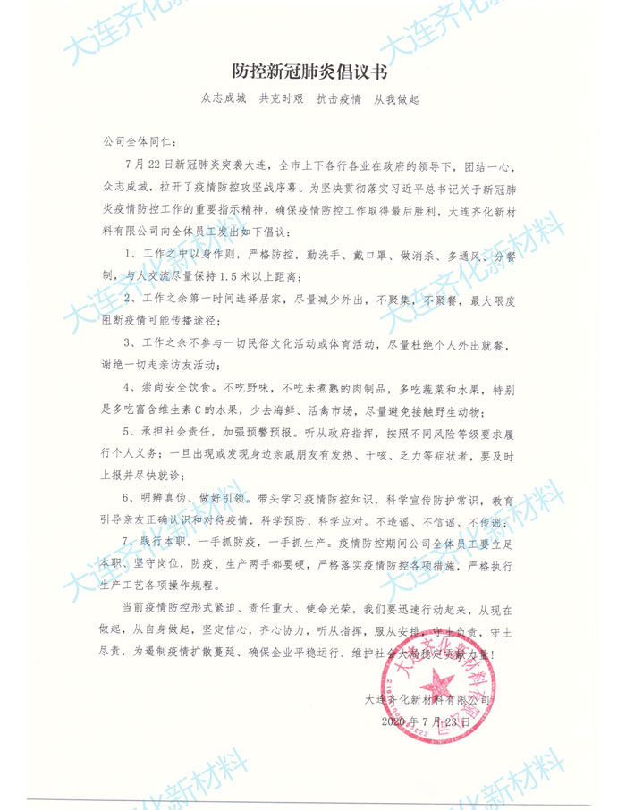 ?大連齊化新材料有限公司防控新冠肺炎倡議書...
